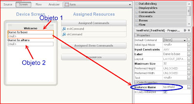 Al arrastrar y soltar el elemento llamado TextField, NetBeans crea automáticamente el objeto, y también automáticamente le da un nombre, como se observa en la figura, el nombre del objeto 1 es llamado textField. El nombre del segundo objeto (objeto 2, en la figura) no se observa pero NetBeans le llama textField1 (dando clic en el objeto se puede ver su nombre de instancia) y si hubiera otro seria textField2 y así sucesivamente se le asignan los nombres a las instancias.