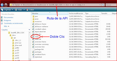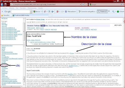 Podemos ver la documentación de la API y observar en detalle como es la estructura de la clase TextField. En nuestro caso vamos a ver la documentación de la API desde el directorio de Sony Ericsson, después de todo se está trabajando con celulares de esta marca. La figura siguiente muestra la ruta exacta de la documentación de la API.