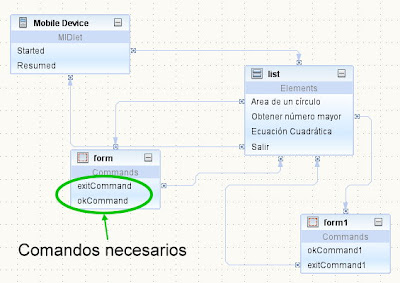 En la figura se remarca que se requieren dos comandos un okCommand encargado de realizar la operación necesaria y un exitCommand que nos regresa al menú principal.